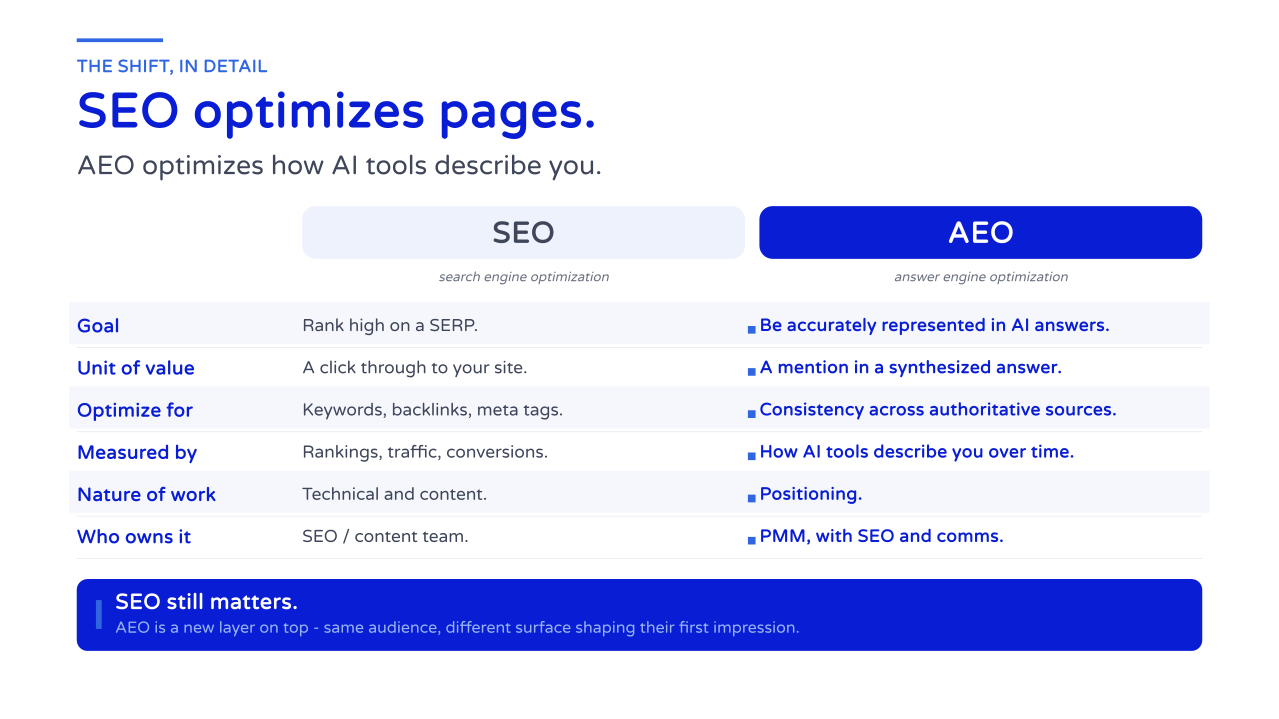 AEO isn't a replacement for SEO, and it's not a purely technical problem to hand off to your web team. It's an extension of what product marketing has always been responsible for: making sure the market understands who you are, what you do, and why it matters.