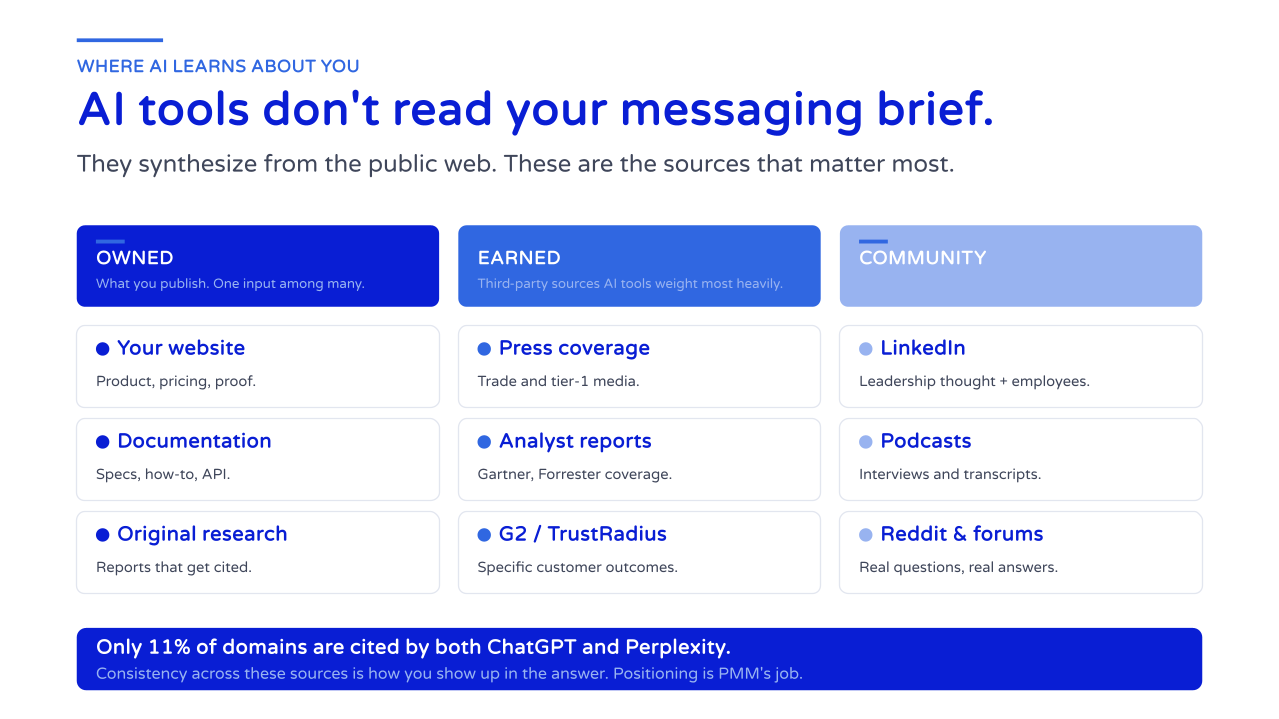 AI tools don't read your messaging brief. They learn from the totality of public content that references your company, synthesizing an understanding from whatever is most available, most consistent, and most credible across the web.