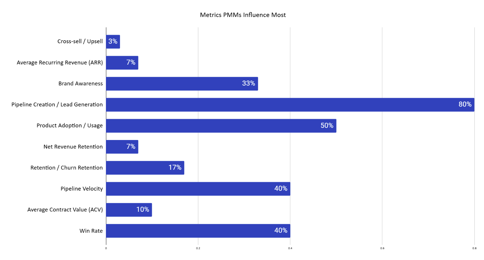 In many organizations, product marketing is engaged primarily during launch preparation or go-to-market execution. In these environments PMM is primarily focused on launch execution, sales enablement, and supporting go-to-market programs rather than shaping how the product will generate revenue. As a result, the impact of product marketing is often measured through downstream go-to-market metrics that PMM influences but does not directly own. Survey respondents reported that PMM most strongly influences metrics such as pipeline creation and lead generation (80%), highlighting how the function’s impact is tied to activities that occur later in the go-to-market process.