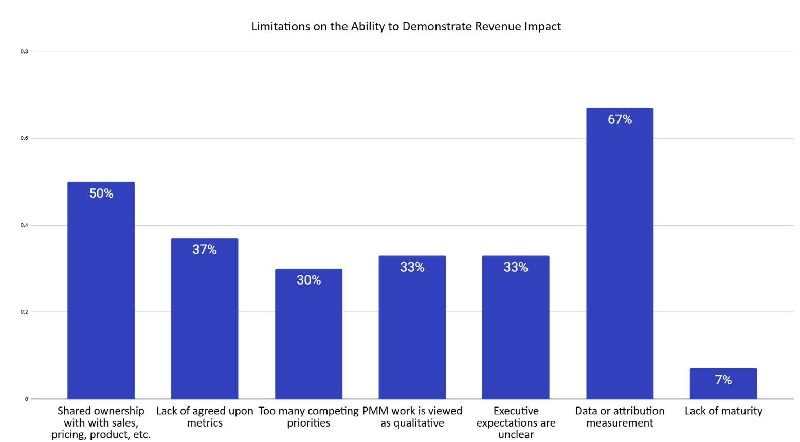 This dynamic also helps explain why many organizations struggle to clearly attribute revenue impact to product marketing. 67% of respondents cited data or attribution limitations as a major barrier to demonstrating PMM’s contribution to revenue outcomes. When PMM enters the process late, its influence is distributed across multiple downstream activities, making it difficult to isolate the role product marketing played in shaping the final outcome.