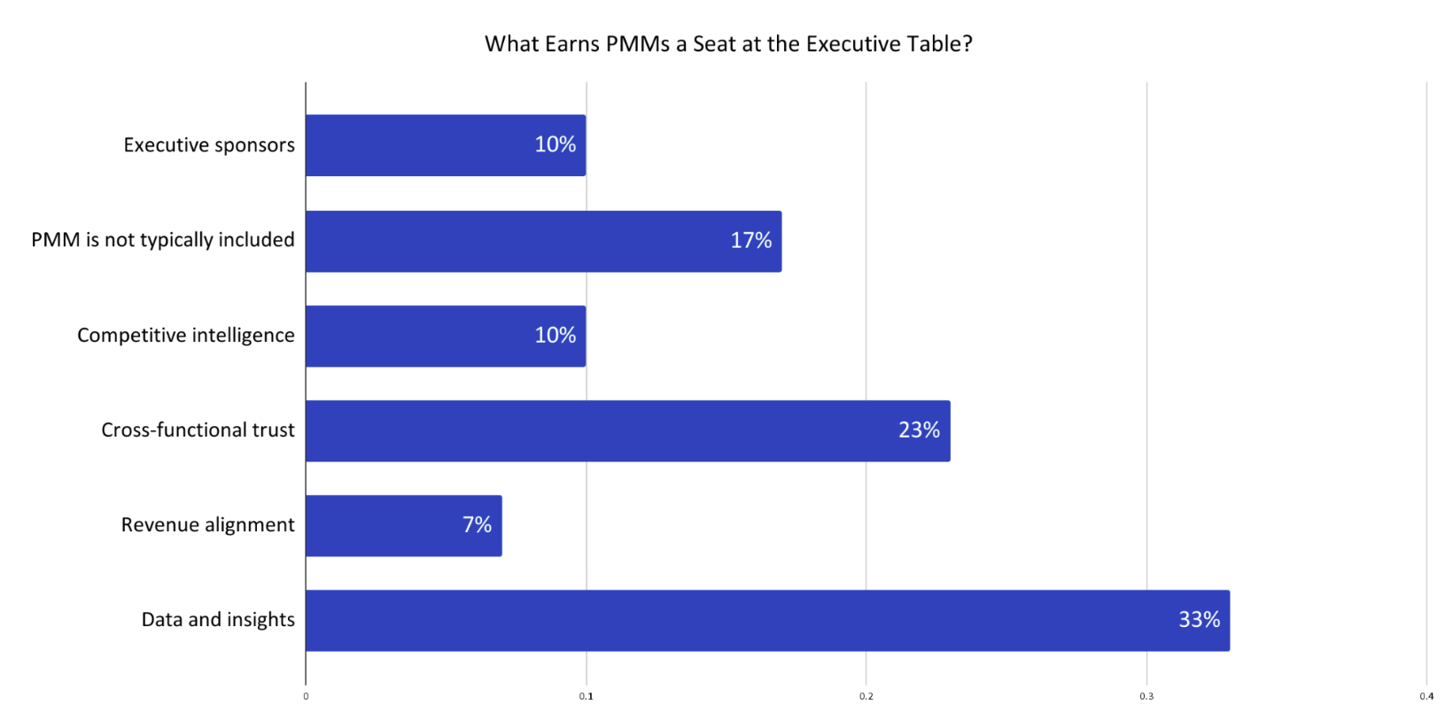 Only 10% of respondents reported having consistent executive sponsorship that brings product marketing into early-stage strategic decisions. In many organizations PMM participates in discussions about go-to-market execution but is less consistently involved in conversations about market prioritization or product investment.